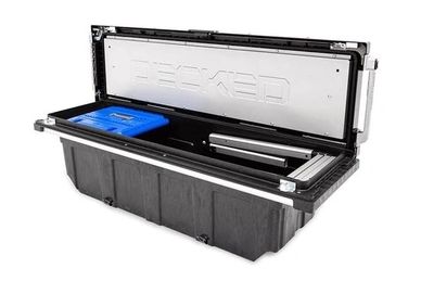 Each DECKED Truck Tool Box comes standard with an easy to grab D-Box (portable toolbox) with hangers inside the tub to hold it in place. A NEW Snack Tray (handy cargo bin for small tools and gear) is also included. Tie-downs are pre-installed at the base of tub secure a moto/ATV or large cargo.